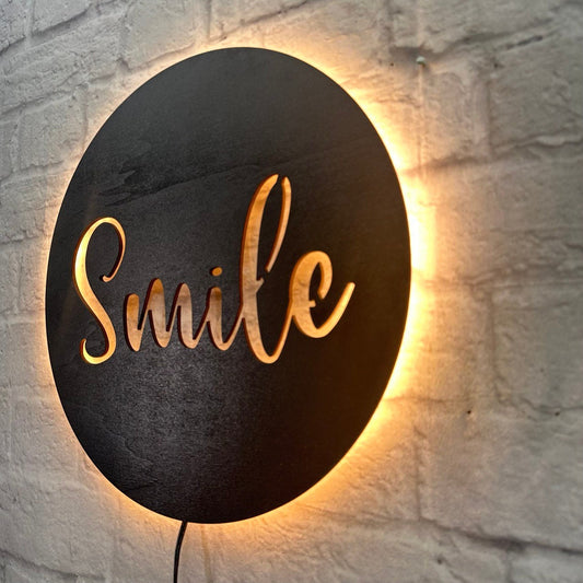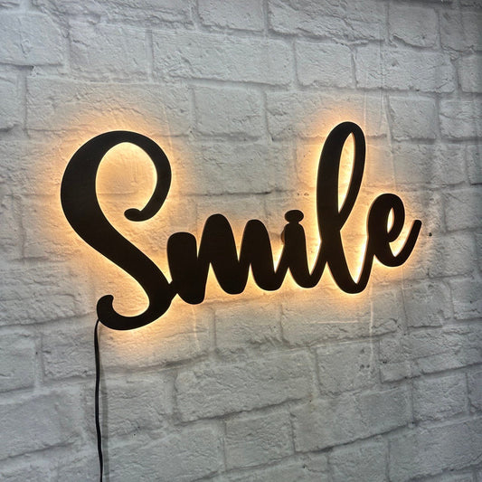 Smile Holzschild 3D Schriftzug mit LED Beleuchtung Geschenk für Geburtstag Wohndeko Wanddeko Kinderzimmerdeko Wandkunst