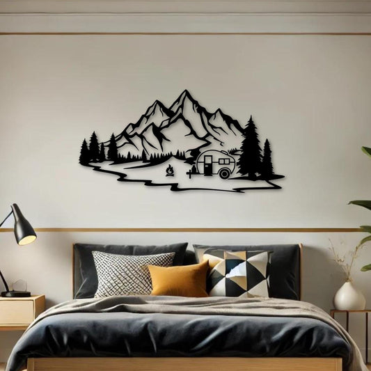 Wandbild aus Holz Berglandschaft mit Wohnwagen Berge Alpen Holzschild zum Aufkleben Deko Wandkunst Geburtstagsgeschenk für Bergsteiger
